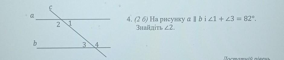 Объяснение: Т.К а║в,то ∠1=∠3,как вн. накрест лежащие углы при параллельных прамых а и в и сек. с. Тогда ∠1=∠3=82°:2=41°.
