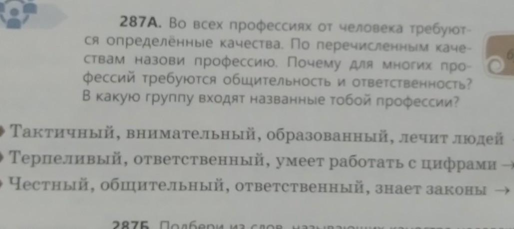 287А. Во всех профессиях от человека требуют- ся определённые качества. По перечисленным каче- ствам назови профессию. Почему для многих про- фессий требуются общительность и ответственность? В какую группу входят названные тобой профессии? Тактичный, внимательный, образованный, лечит людей • Терпеливый, ответственный, умеет работать с цифрами - • Честный, общительный, ответственный, знает законы