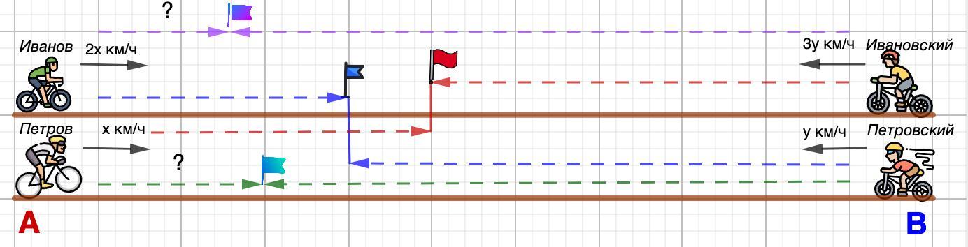 4. Из города Ав город В одновременно выехали два мотоциклиста Петров и Иванов, и в тот же момент из города В навстречу им выехали мотоциклисты Ивановский и Петровский. Иванов едет в два раза быстрее Петрова, а Ивановский в три раза быстрее Петровского. Иванов встретил Петровского в ТОТ же момент, когда Петров встретил Ивановского. Чья встреча произошла ближе к городу А: Иванова с Ивановским или Петрова с Петровским?