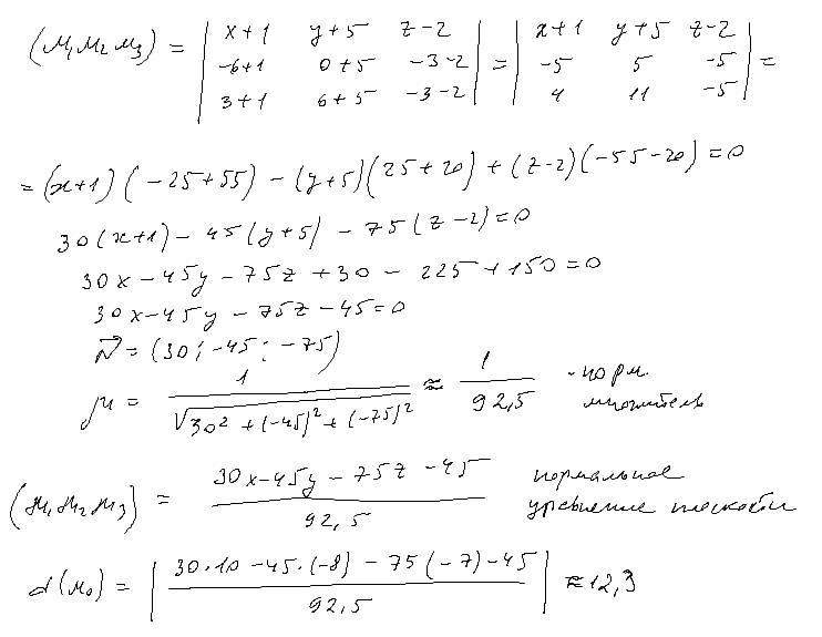 Составить уравнение плоскости через определитель - смешанное произведение векторов (ММ1, М1М2, М1М3)=0. Написать нормальное уравнение плоскости. Найти расстояние, подставив точку М0 в нормальное уравнение плоскости