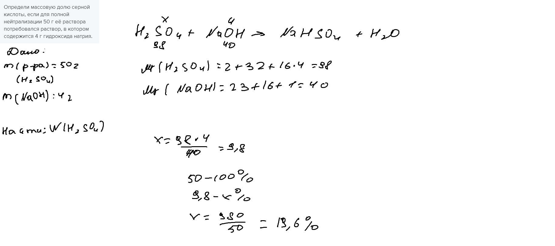 Определи массовую долю серной кислоты, если для полной нейтрализации 50 г её раствора потребовался раствор, в котором содержится 4 г гидроксида натрия.