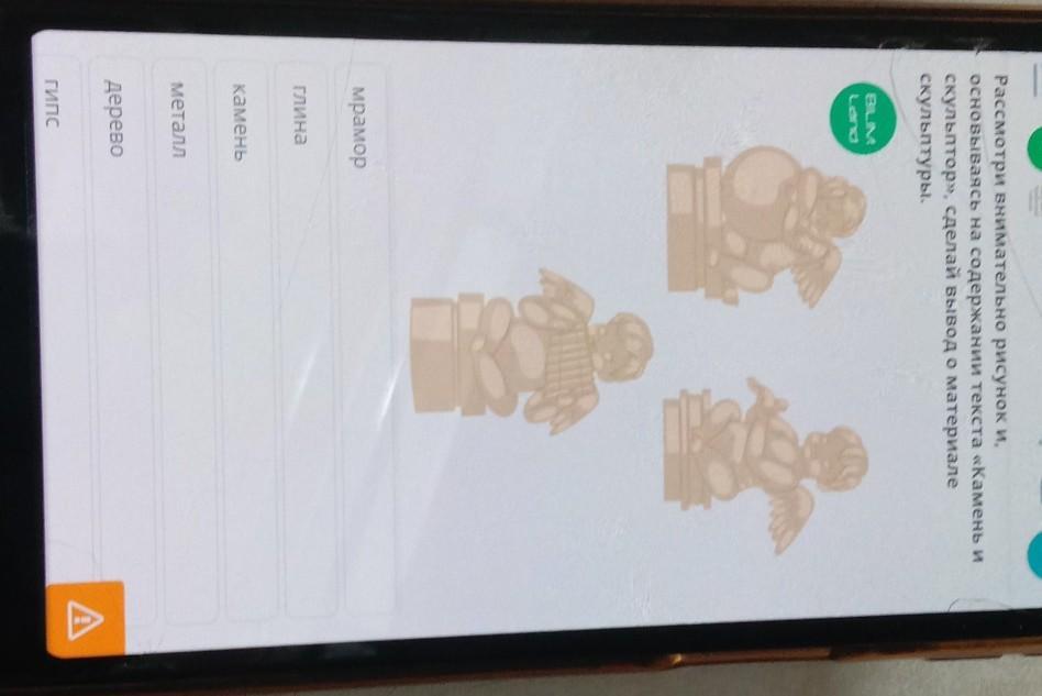 Рассмотри внимательно рисунок и, основываясь на содержании текста «Камень и скульптор», сделай вывод о материале скульптуры. BIUM Land E мрамор глина камень металл дерево A ГИПС