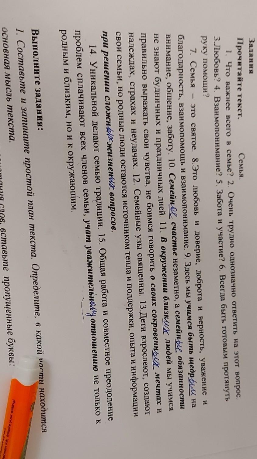 Задання Прочитайте текст. Семья 1 Что важнее всего в семье? 2. Очень трудно однозначно ответить на тот вопрос 3.Любовь? 4. Взаимопонимание? 5. Забота и участие? 6. Всегда быть готовым протянуть руку помощи? 7. Семья - это святое. 8. Это любовь и доверие, доброта и верность, уважение и благодарность, взаимопомощь и взаимопонимание. 9. Здесь мы учимся быть щедрол на внимание, общение, заботу. 10. Семейное счастье незаметно, а семейни обязанности не знают будничных и праздничных дней. 11, в окружении близких людей мы учимся правильно выражать свои чувства, не боимся говорить о своих сокровенное мечтах и надеждах, страхах и неудачах. 12. Семейные узы священны. 13.Дети взрослеют, создают свои семьи, но родные люди остаются источником тепла и поддержки, опыта и информации при решении сложнжизненых вопросов. 14. Уникальной делают семью традиции. 15. Общая работа и совместное преодоление проблем сплачивают всех членов семьи, учат уважительное отношению не только к родным и близким, но и к окружающим, Выполните задания: 1. Составьте и запишите простой план текста. Определите, в какой части находится основная мысль текста. p, num danau