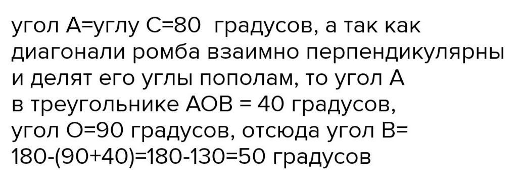 диагонали ac и bd ромба abcd пересекаются в точке o. найдите углы треугольника aob если bcd на 80 градусов больше abc