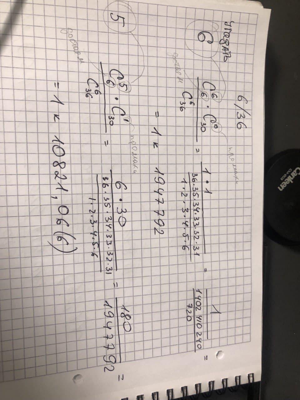 итак достаем 6 из 36. Далее, на картинке, приведен расчет для вычисления 6 угаданных, и 5 угаданных (при извлеченных 6 шариках):