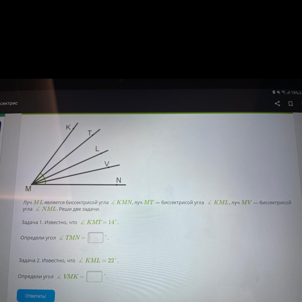 Луч ML является биссектрисой угла & KMN, луч MT — биссектрисой угла KML, луч MV — биссектрисо