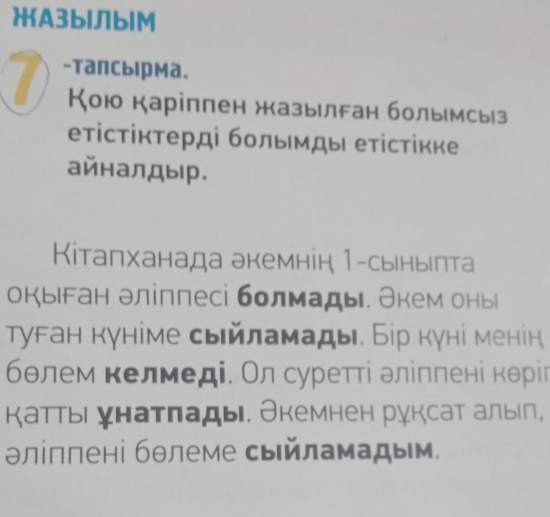 ЖАЗЫЛЫМ 7-тапсырма. Қою қаріппен жазылған болымсыз етістіктерді болымды етістікке айналдыр. Кітапханада әкемнің 1-сыныпта оқыған әліппесі болмады. Әкем оны туған күніме сыйламады. Бір күні менің бөлем келмеді. Ол суретті әліппені көріп қатты ұнатпады. Әкемнен рұқсат алып, әліппені бөлеме сыйламадым.