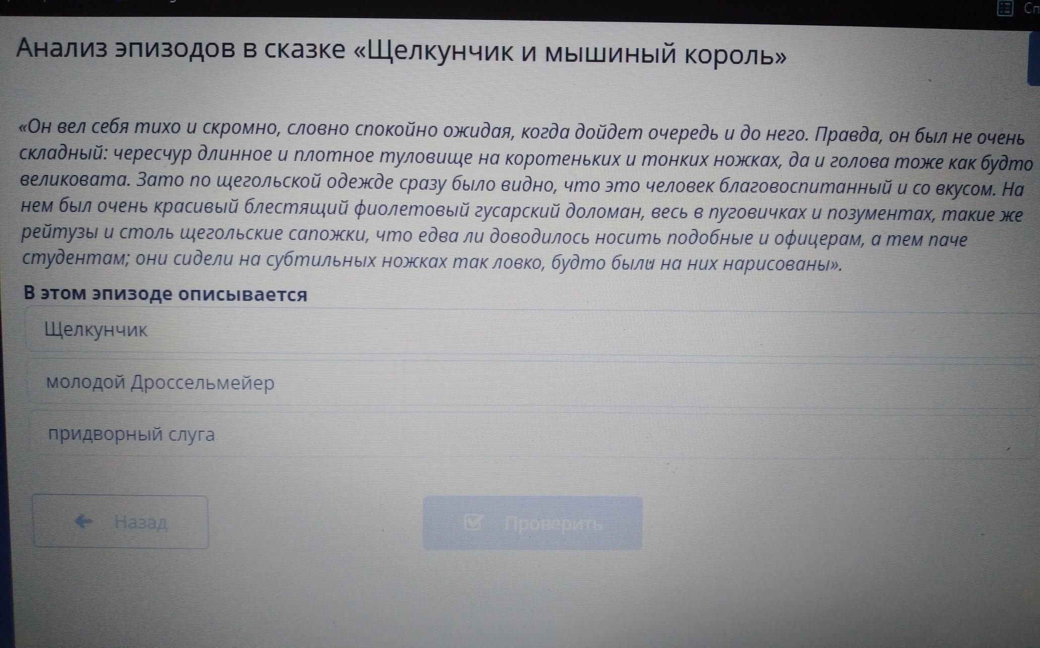 ПОЖАЛУЙСТААА ПОМОГИТЕ♥Анализ эпизодов в сказке «Щелкунчик и мышиный король» «Он вел себя тихо и скромно, словно спокойно ожидая, когда дойдет очередь и до него. Правда, он был не очень Складный: чересчур длинное и плотное туловище на коротеньких и тонких ножках, да и голова тоже как будто великовата. Зато по щегольской одежде сразу было видно, что это человек благовоспитанный и со вкусом. На нем был очень красивый блестящий фиолетовый гусарский доломан, весь в пуговичках и попументах, такие же рейтузы и столь щегольские сапожки, что едва ли доводилось носить подобные и офицерам, а тем паче студентам; они сидели на субтильных ножках так ловко, будто были на них нарисованы». В этом эпизоде описывается: