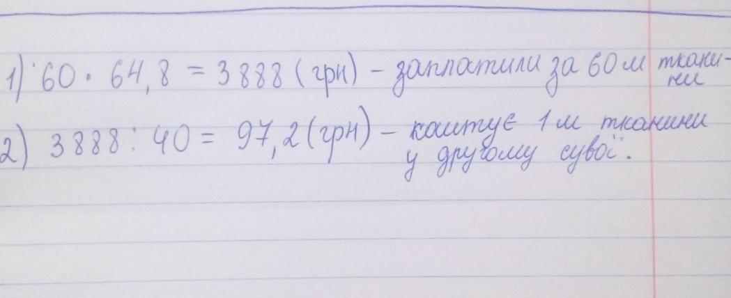 1)60•64,8=3888(грн)-вартість першого сувою тканини