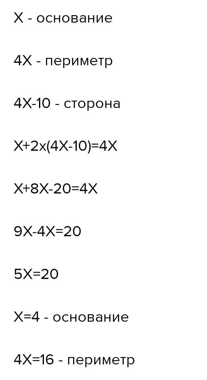 Периметр равнобедренного треугольника в 4 раза больше основания и на 10см больше боковой стороны. Найдите стороны треугольника