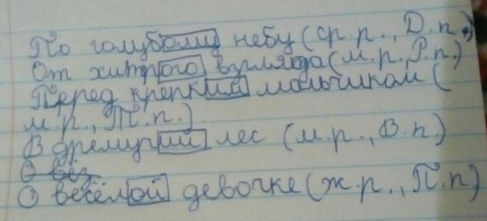 голубому (ому, д.п.,ед.ч.,ср.р),хитрого (ого, р.п. ед.ч.,м.р), крепким (им, т.п.,ед.ч.,м.р.),дремучий (ий, им.п.,ед.ч.,м.р.) весёлой(ой, п.п.,ед.ч.,ж.р.)