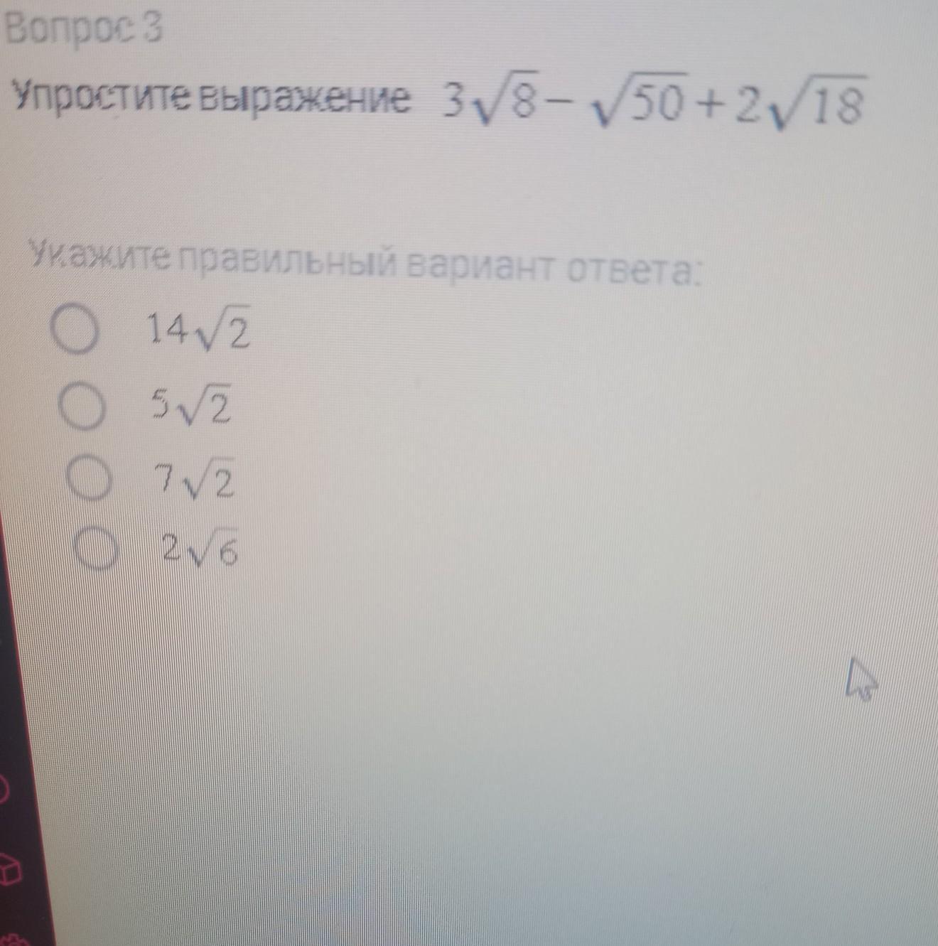 \displaystyle 3\sqrt{8}-\sqrt{50}+2\sqrt{18}=6\sqrt{2}-5\sqrt{2}+6\sqrt{2}=7\sqrt{2}