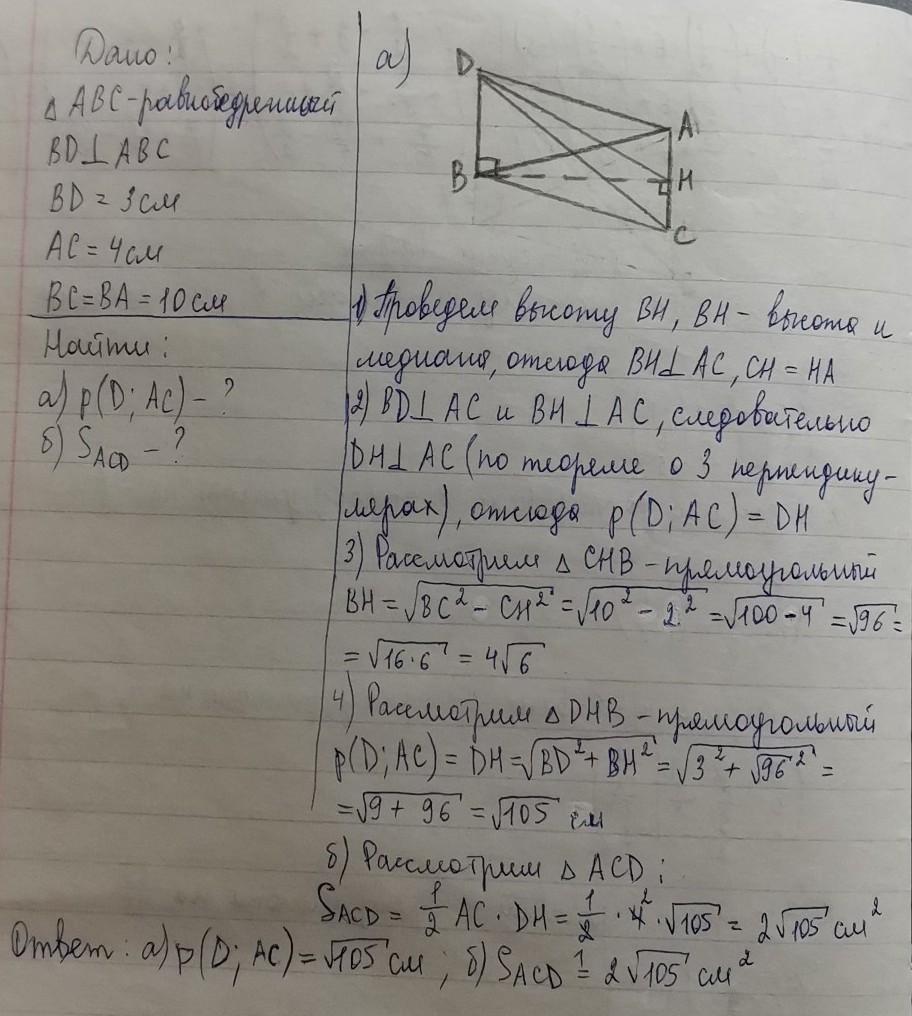прямая BD перпендикулярна к плоскости треугольника ABC известно что BD равно 3 см АС равно 4 см BC равно Ba = 10 см Найдите расстояние от точки D до прямой AC B площадь треугольника ACD