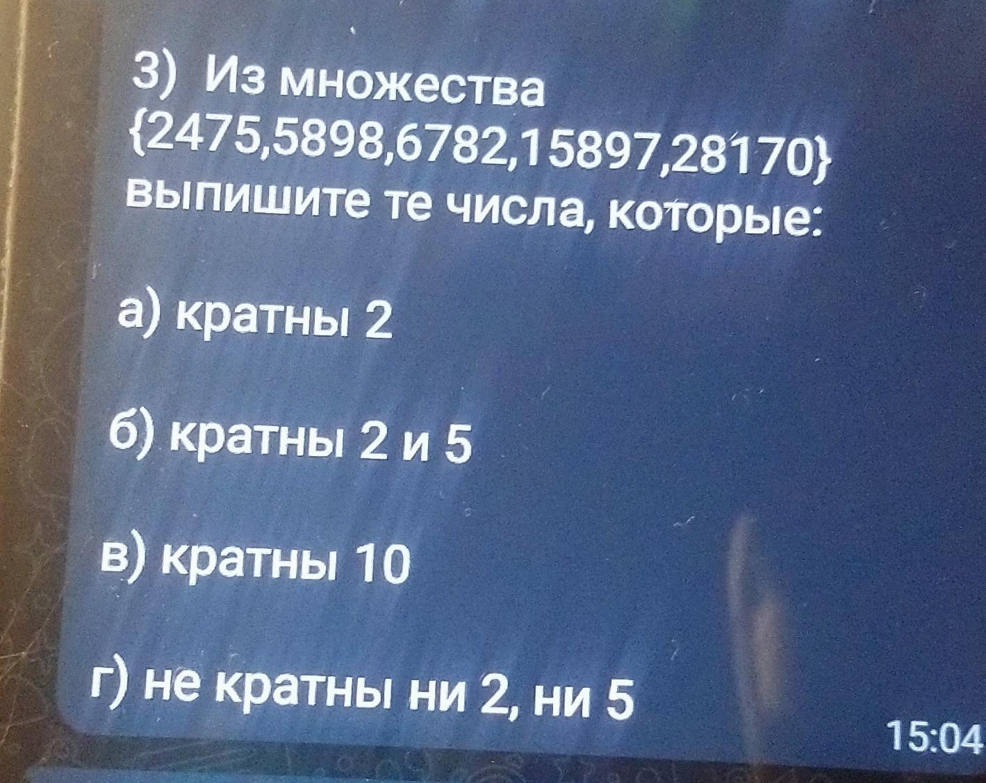 кратны 2: 5898,6782,28170 , кратны 2 и 5: 28170, кратны 10: 28170, не кратны ни 2 ни 5: 15897