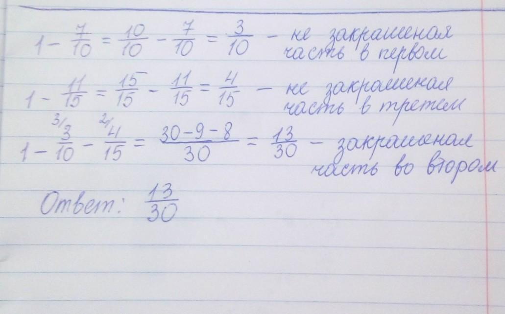 3) 3/10 + 4/15 = 9/30 + 8/30= 17/30 не закрашено на обеих фигурах