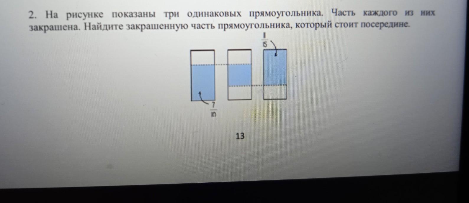 2. На рисунке показаны три одинаковых прямоугольника. Часть каждого из них закрашена. Найдите закрашенную часть прямоугольника, который стоит посередине.