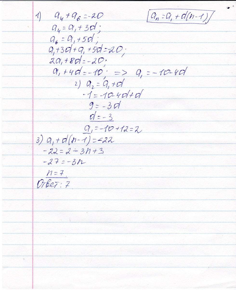 в арифметической прогрессии второй член равен -1, сумма четвертого и шестого члена равна -20, а n-ый член равен -22.Чему равно n ?
