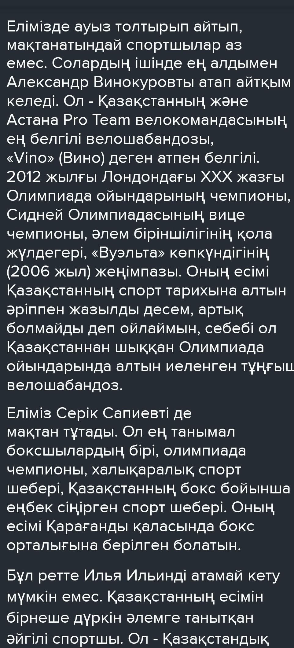 1 тапсырма «Атақты Қазвқстан спортшысы» тақырып бойынша , әңгіме құрастырыңыз.Помогите пожалуйста