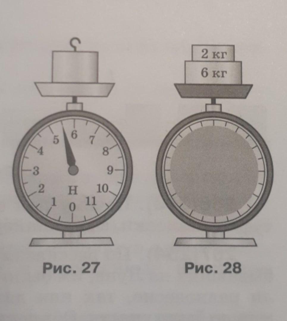 2) Шкала динамометра закрыта (рис. 28). Определите, какую силу показывает динамометр. Изменятся ли показания динамометра, если грузы поменять местами?