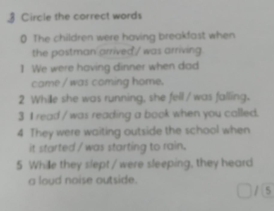 срочно 50 балов даю 3 Circldinner when dade the correct words 1 We were having came/was coming home, 2 While she was running, she fell / was falling. 3 I read / was reading a book when you called 4 They were waiting outside the school when it started / was starting to rain. 5 While they slept/ were sleeping, they heard a loud noise outside.