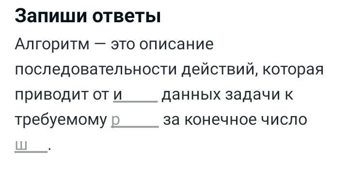 алгоритм-это описание последовательности действий, которое приводит от исходных данных задачи к требуемому результату за конечное число шагов.