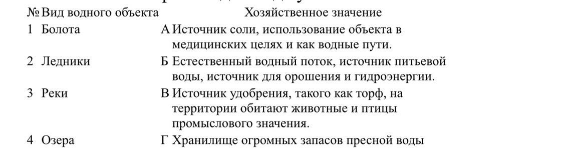 1. Установите соответствие, определив хозяйственное значение некоторых видов вод суши.пожалуйста