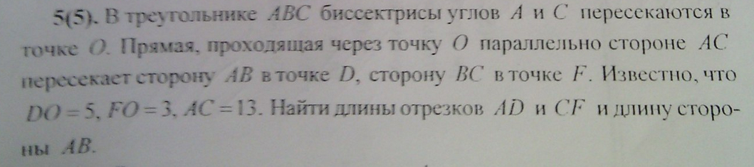 треугольник АВС, АМ и СК - биссектрисы, ДФ параллельна АС, ДО=5, ОФ=3, АС=13,, уголОАС=уголАОД как внутренние разносторонние=уголДАО, треугольник АДО равнобедренный, АД=ДО=5, уголАСО=уголСОФ как внутренние разносторонние=уголОСФ, треугольник ОСФ равнобедренный, ОФ=ФС=3, треугольник АВС подобен треугольнику ДВФ по двум равным углам (уголВ - общий, уголА=уголВДК как соответственные), ВД/АВ=ДФ/АС, ДФ=ДО+ОФ=5+3=8, ВД=х, АВ=ВД+АД=х+5, х/(х+5)=8/13, 8х+40=13х, 5х=40, х=8=ВД, АВ=8+5=13