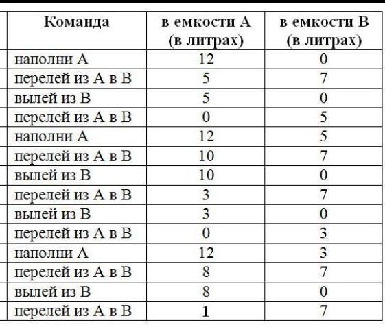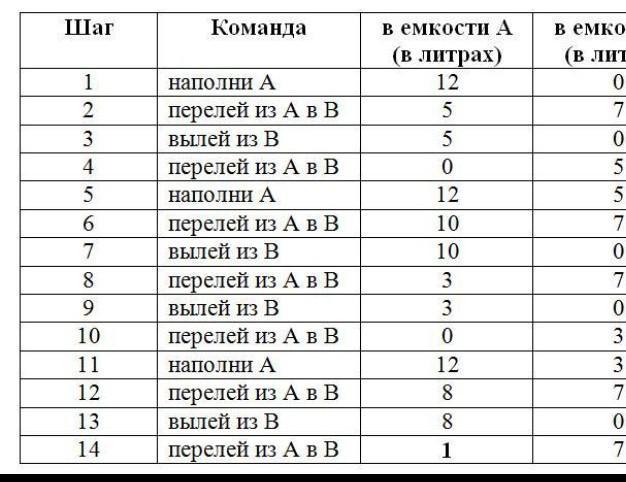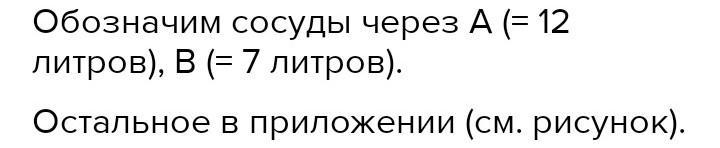 обозначим сосуды через А(=12литров),В(=7 литров.Всё остальное там есть.
