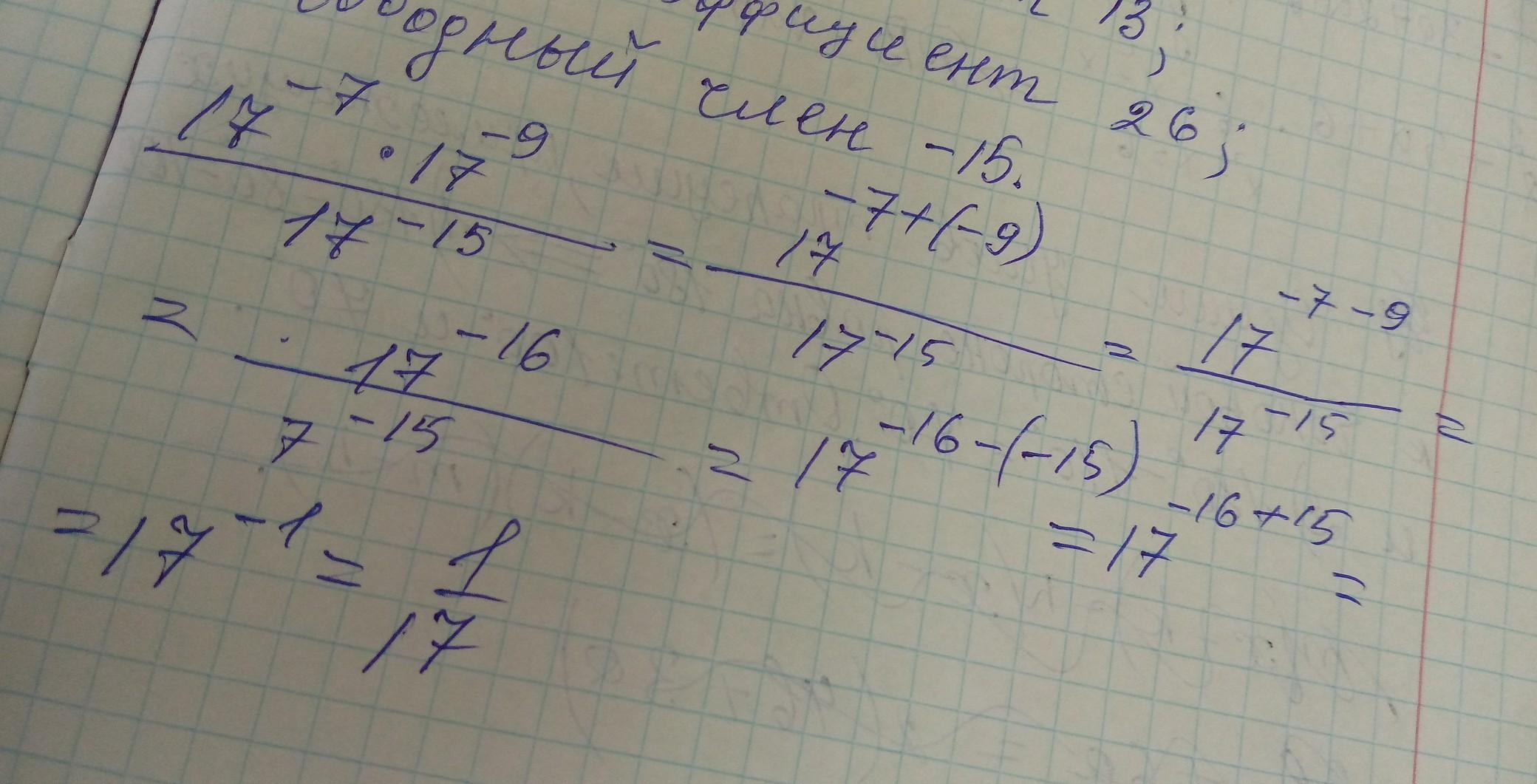 17^-7*17^-9/17^-15=17^(-7-9) / 17^-15=17^-16/17^-15=17^(-16-(-15))=