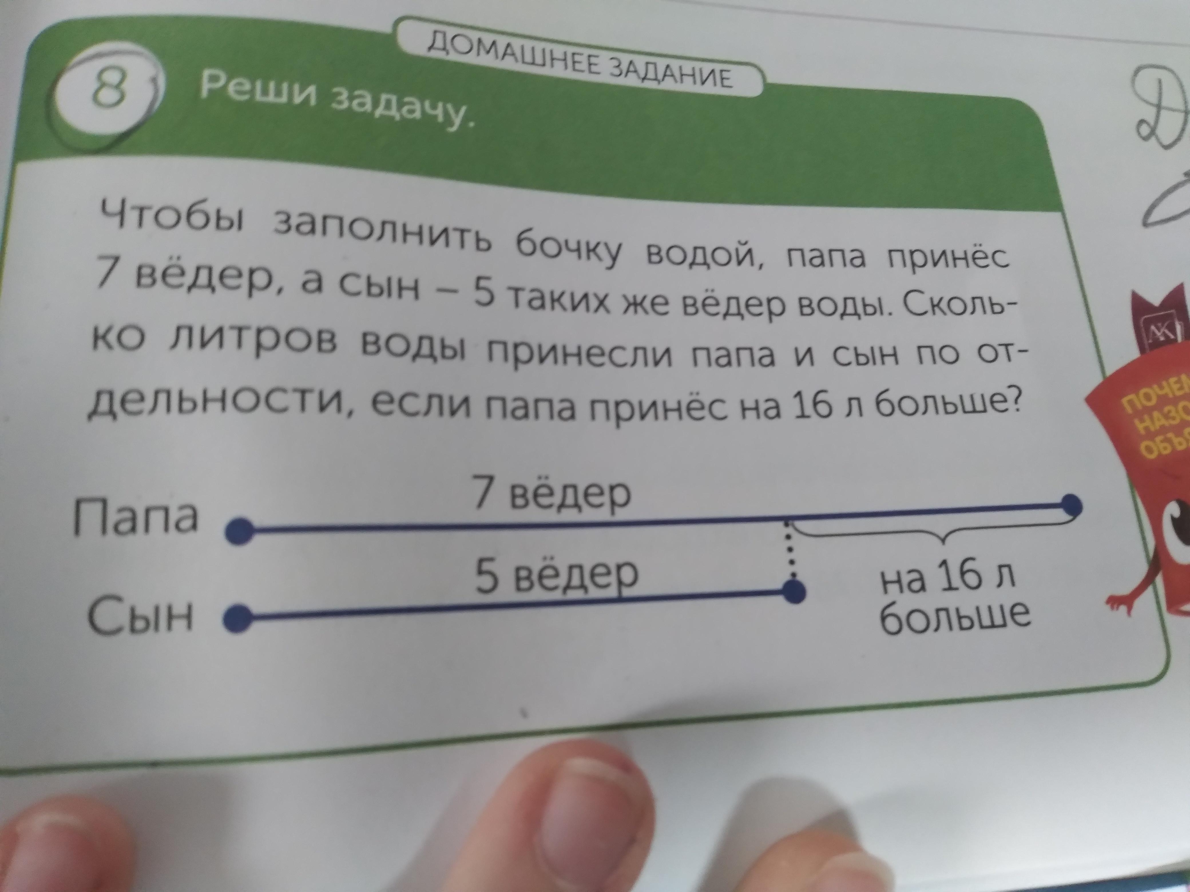 Также получается если папа принёс на 16 литров больше и на 2 ведра больше то