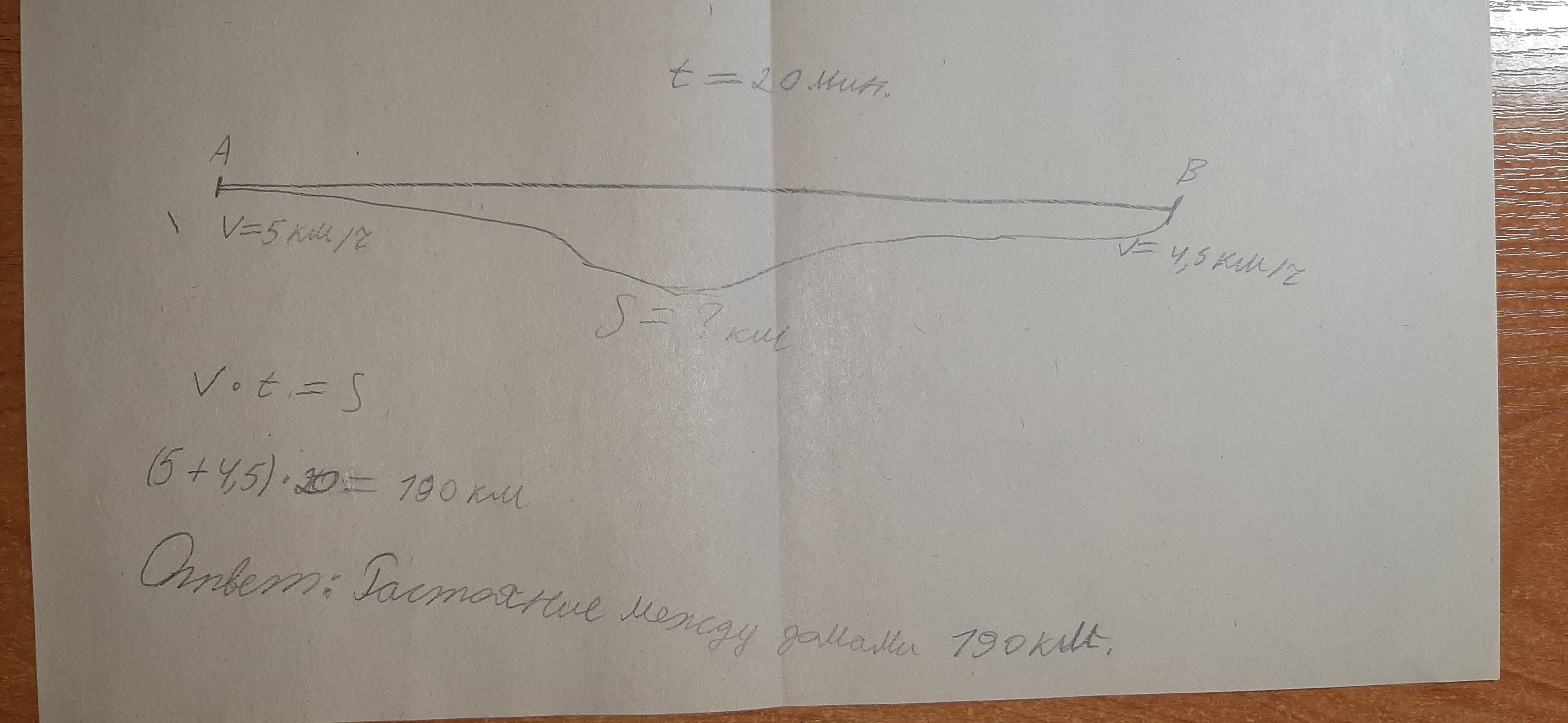 11. Одновременно навстречу друг другу вышли из своих домов два приятеля и через 20 минут встретились. Найти расстояние между домами, если скорости ребят равны 5 км/чи 4,5 км/ч. Помогите пожалуйста разобраться