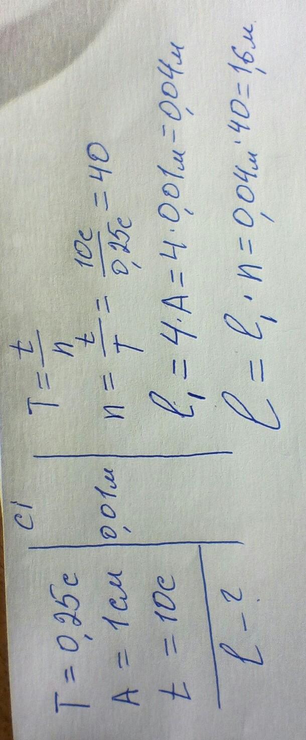 поплавок здійснює незатухаючі коливання у воді, період яких 0,25с. Амплітуда коливань 1см. який шлях пройде поплавок за 10с?