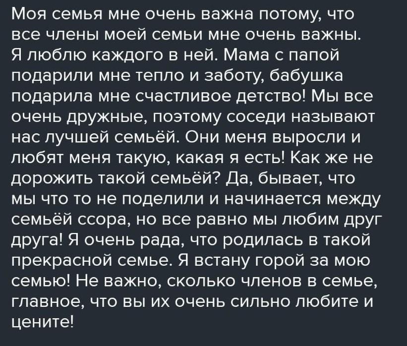 Моя семья мне важна потому что она мне очень дорога. Семья может помочь в трудную минуту и поддержать. Семья ради нас готовы на всё. Они могут работать и ночами и днями цените семью и любите её до конца своей жизни.