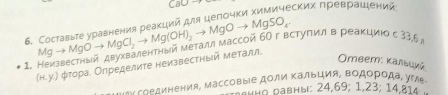 Mg - MgO - MgCl, Mg(OH), Mgo • 1. Неизвестный двухвалентный металл массой 60 г вступил в реакцию с 33,6 л (н.у.) фтора. Определите неизвестный металл. Ответ: кальций, ry , na rno 1 ЗАДАНИЕ