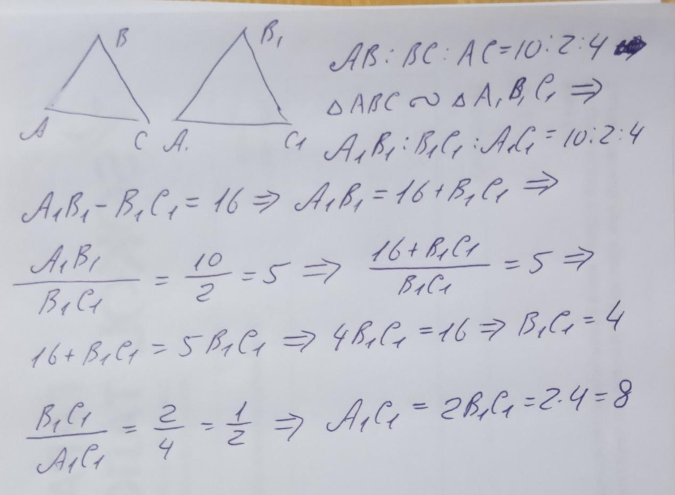7. Сторони трикутника відносяться як 10:2:4.Знайдіть середню сторону подібного трикутника, різниця найбільшої і найменшої сторін якого дорівнює 16 см.