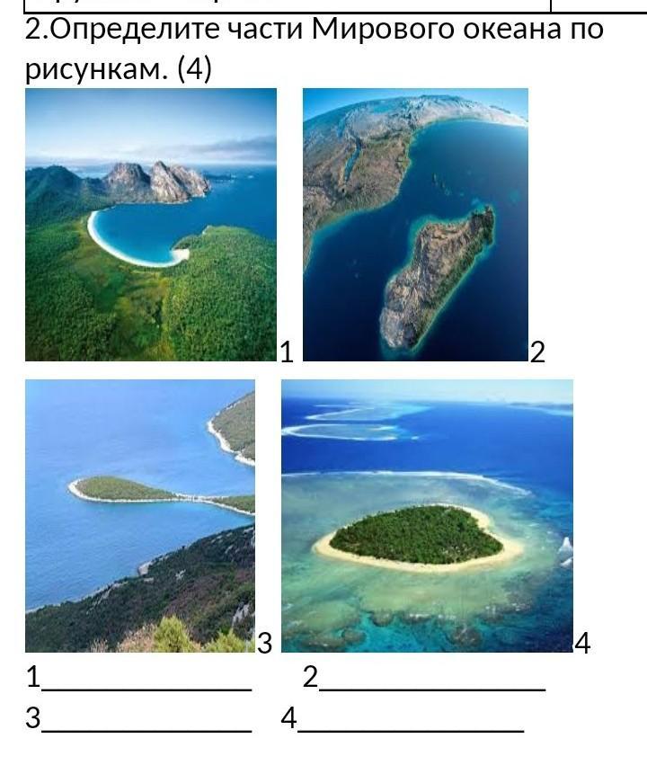 2.Определите части Мирового океана по рисункам. (4) 1 2 3 4 1_____________ 2______________ 3_____________ 4______________