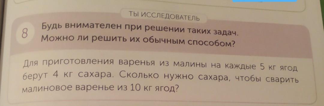 810 35 ТЫ ИССЛЕДОВАТЕЛЬ Будь внимателен при решении таких задач. Можно ли решить их обычным способом? 8 Для приготовления варенья из малины на каждые 5 кг ягод берут 4 кг сахара. Сколько нужно сахара, чтобы сварить малиновое варенье из 10 кг ягод?!....