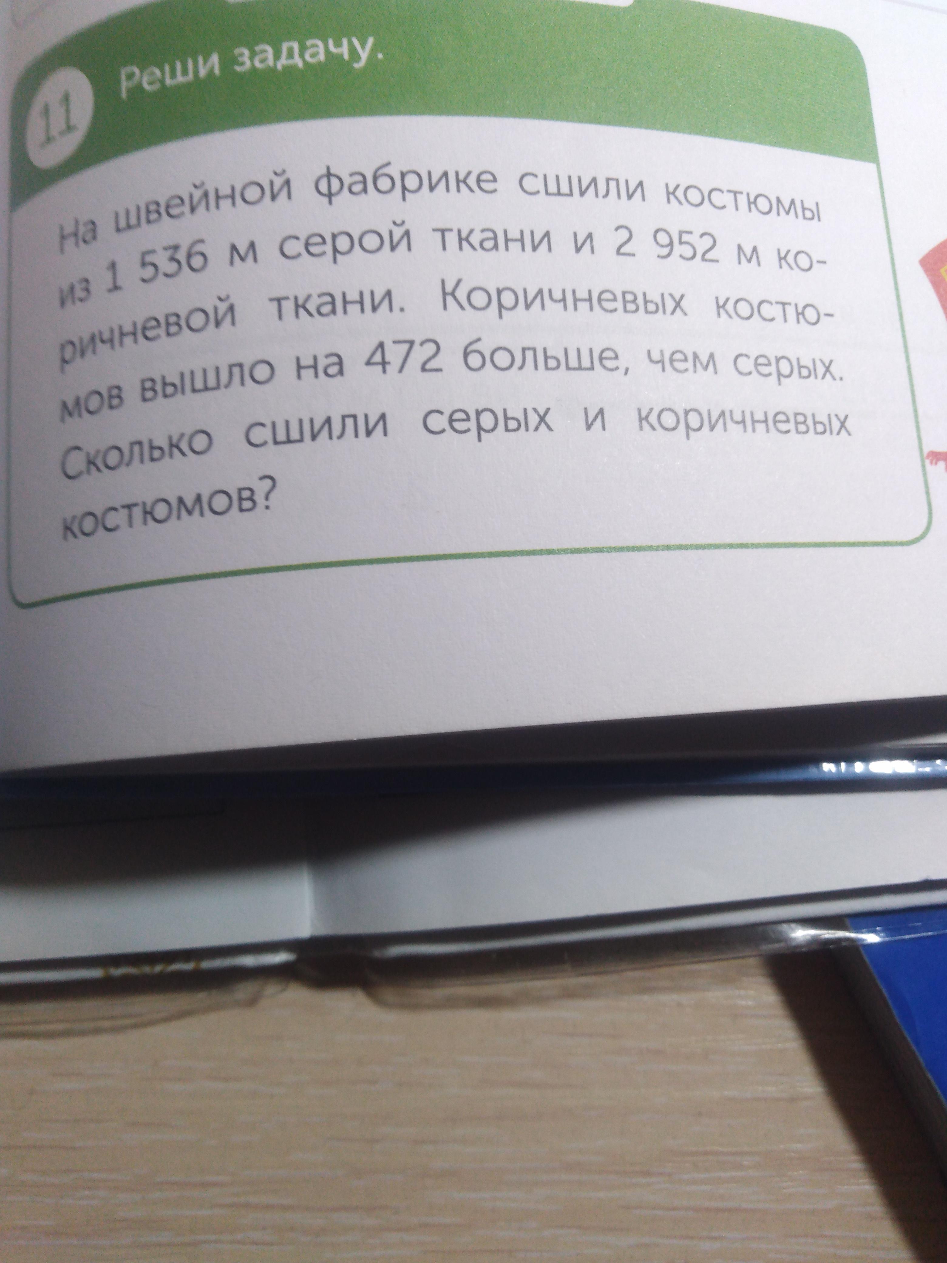 : 1)2952-1536=1416 м коричневой ткани пошло на 472 костюма