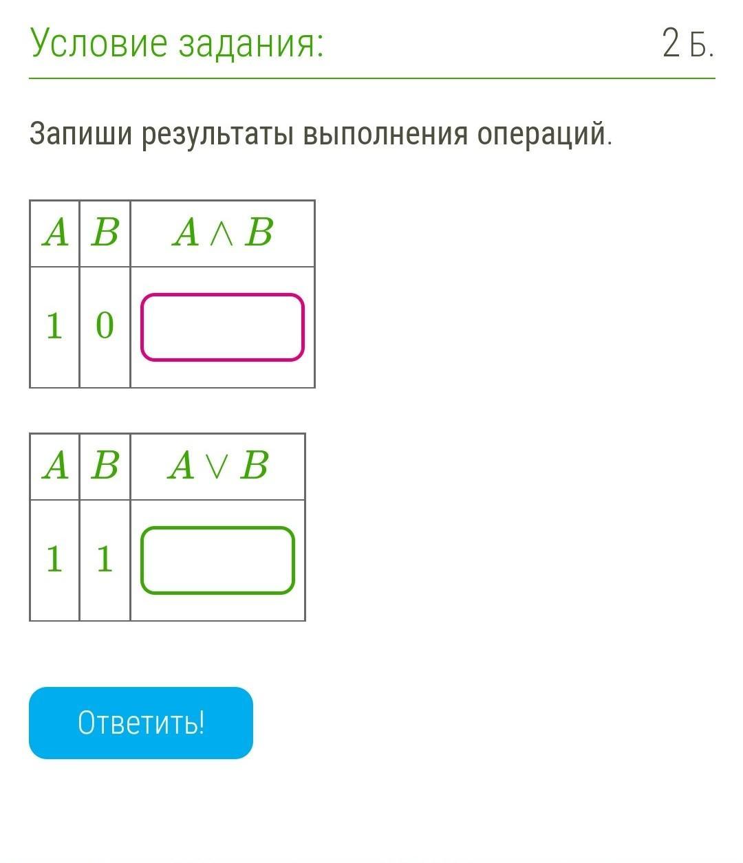 A \: \wedge \: B = 1 \: \wedge \: 0 = 0 \\ A \: \lor \: B = 1 \: \lor \: 1 = 1