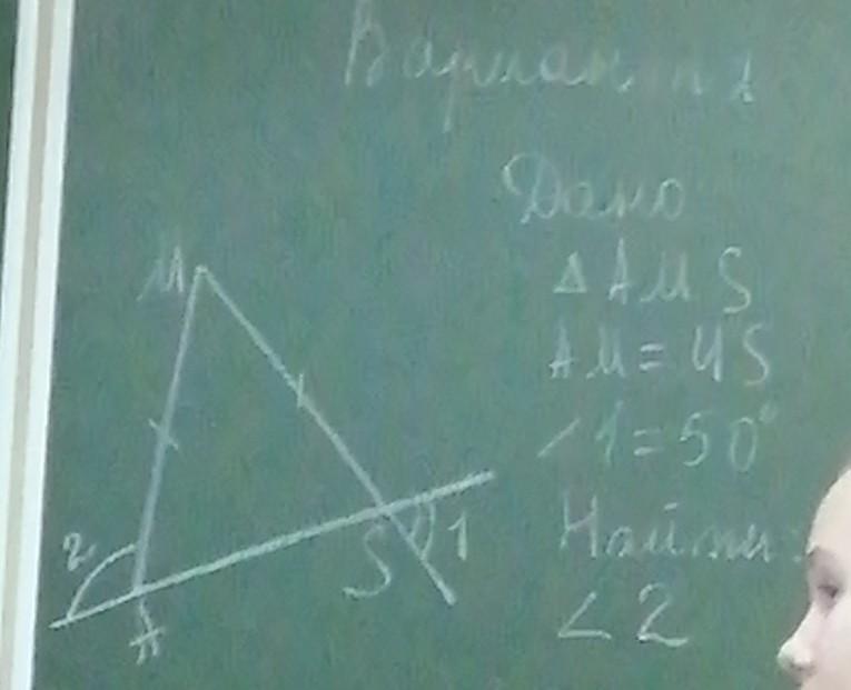 Тк. Треугольник AMS равнобедренный, то угол MSA =углу МАS. Угол МSA равен углу 1 (как вертикальные) =50 градусов. Из выше сказанного угол МАS также равен 50, соответственно угол 2 равен 180 - 50=130 градусов