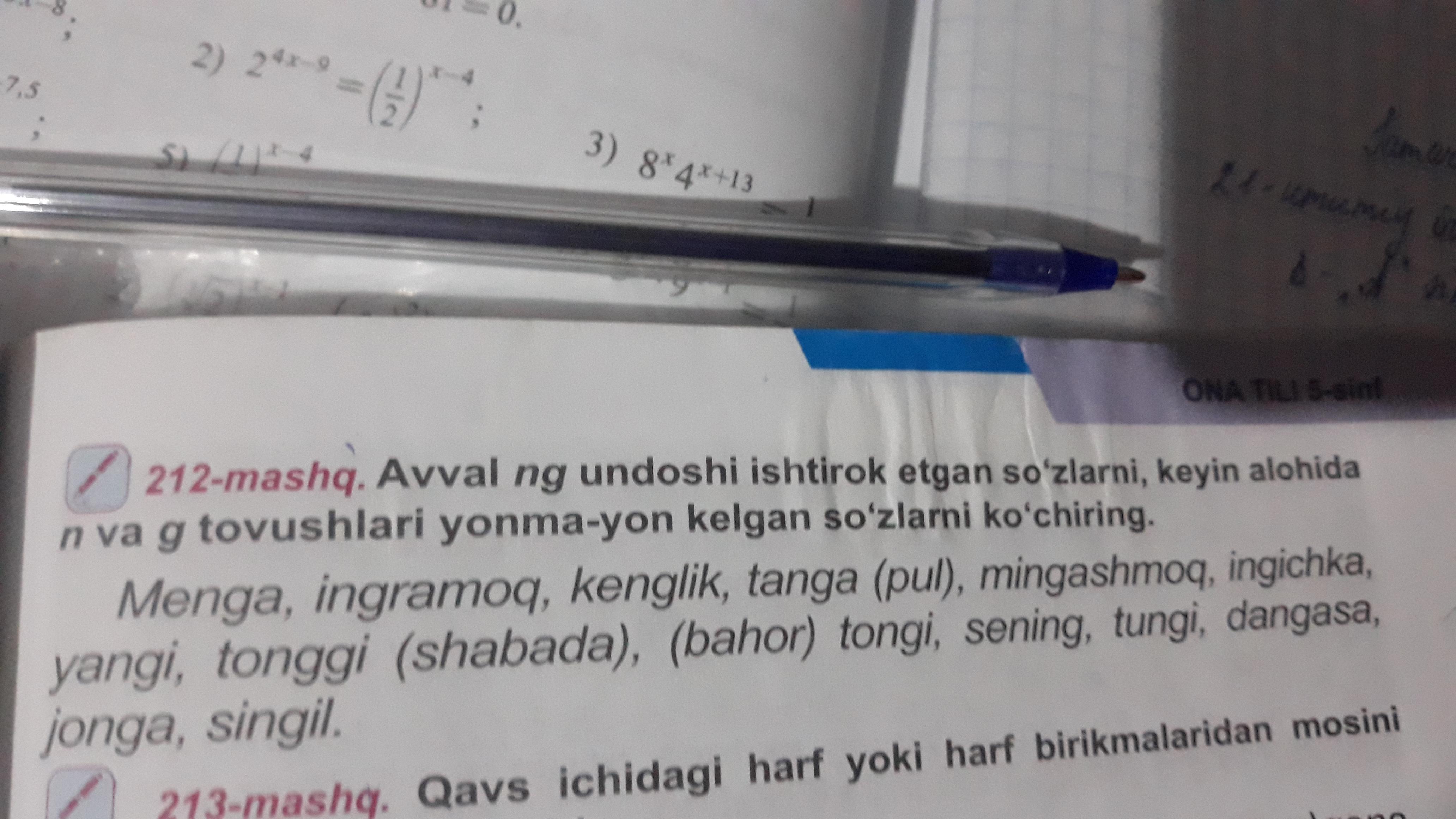 212-mashq. Avval ng undoshi ishtirok etgan sòzlarni, keyin alohoda n va ga tovushlari yonma-yon kelgan sòzarni kòchiring