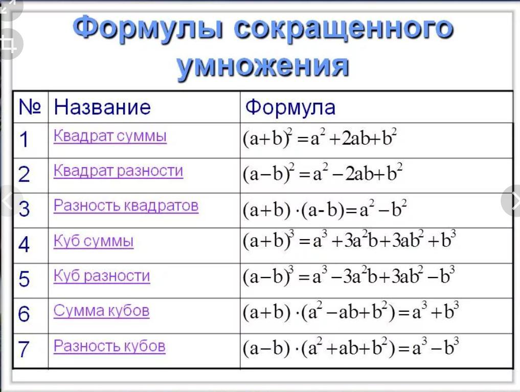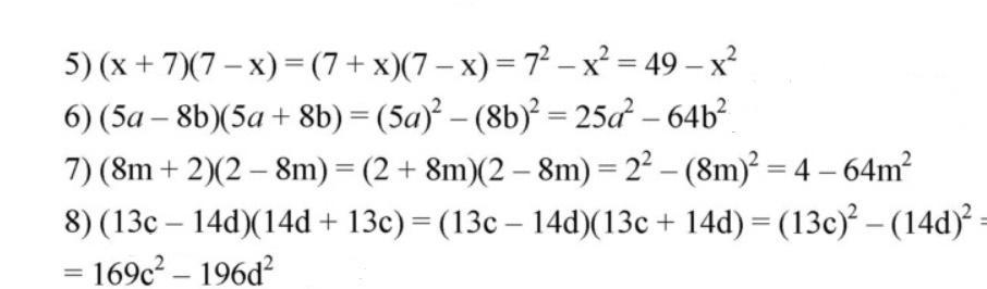 для примера: (с+2) (с-2), воспользуемся формулой (а+б) (а-б) = а(во второй) - б(во второй), и у нас получается с(во второй) - 2( во второй) т.е 4
