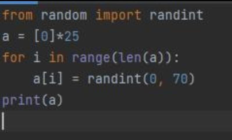 3. Дан массив, состоящий из 25 элементов. Заполнить массив случайными числами в диапазоне от 0 до 70 и вывести на экран.