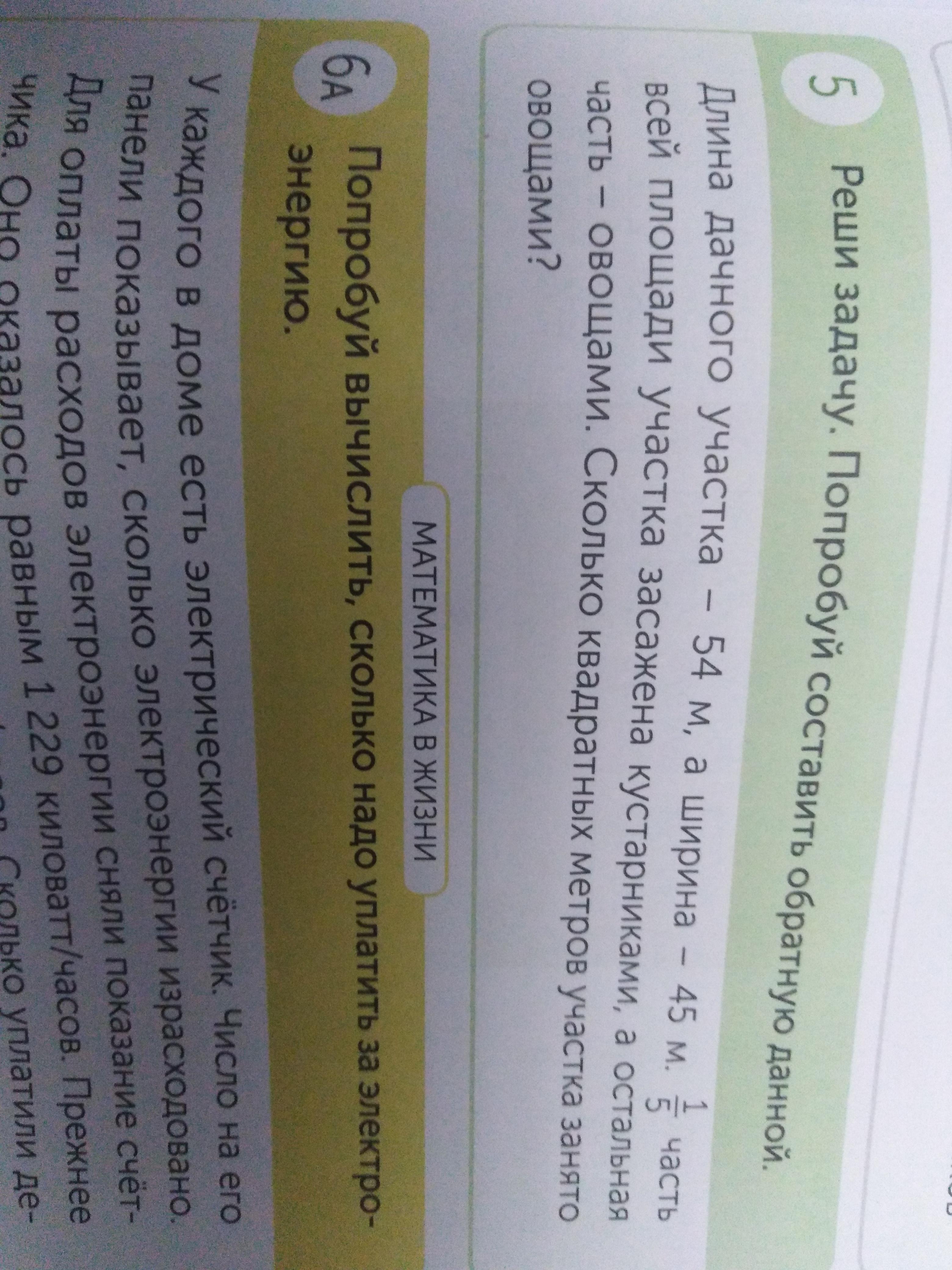 Здесь нам нужно было узнать одну часть имею вторую часть и площадь (имеющая длину и ширину), теперь составим задачу:
