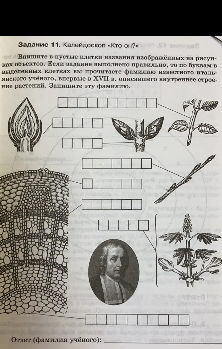 впишите в пустые клетки названия изображённых на рисунках объектов. если задание выполнено правильно , то по буквам в выделенных клетках вы прочитаете фамилию известного итальянского ученого, впервые в 17 в. описавшего внутренне строение растений. запишите эту фамилию.