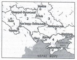 1. Якою цифрою позначено на картосхемі українські землі, що увійшли до складу Австрійської імперії в другиій половині XVIII ст. внаслідок поділів Речі Посполитої?