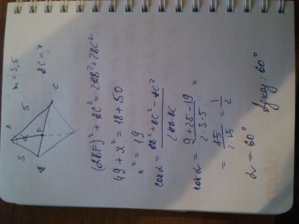 Две стороны треугольника равны 3 и 5см. Медиана, проведённая к третьей стор, равна 3,5 см. Найти угол треугольника, заключенный между данными сторонами.