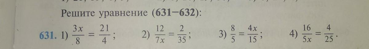 Решите уравнение (631-632): 3х 21 12 2 631. 1) 2 8. 4 35 8 16 4 = 2) 2 - == 3) Ол оо 4х 15 4) = 7x 5 5х 25