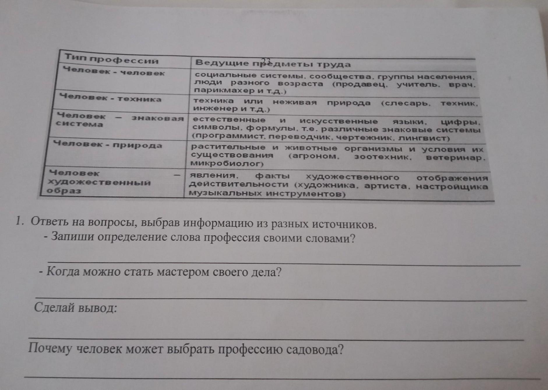 1. Ответь на вопросы, выбрав информацию о разных источников Запиши определение слова профессия своими словами? Когда можно стап, мастером своего дела Сделай вывод Почему человек может выбрать профессио салонода?Сор по русскому помогите ПЖ