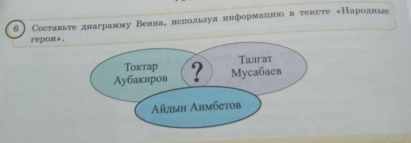 Составьте диаграмму Венна, используя информацию в тексте «Народные герои». Токтар Аубакиров ? Талгат Мусабаев Айдын Аимбетов. помогите пжпж срочно нужно пж